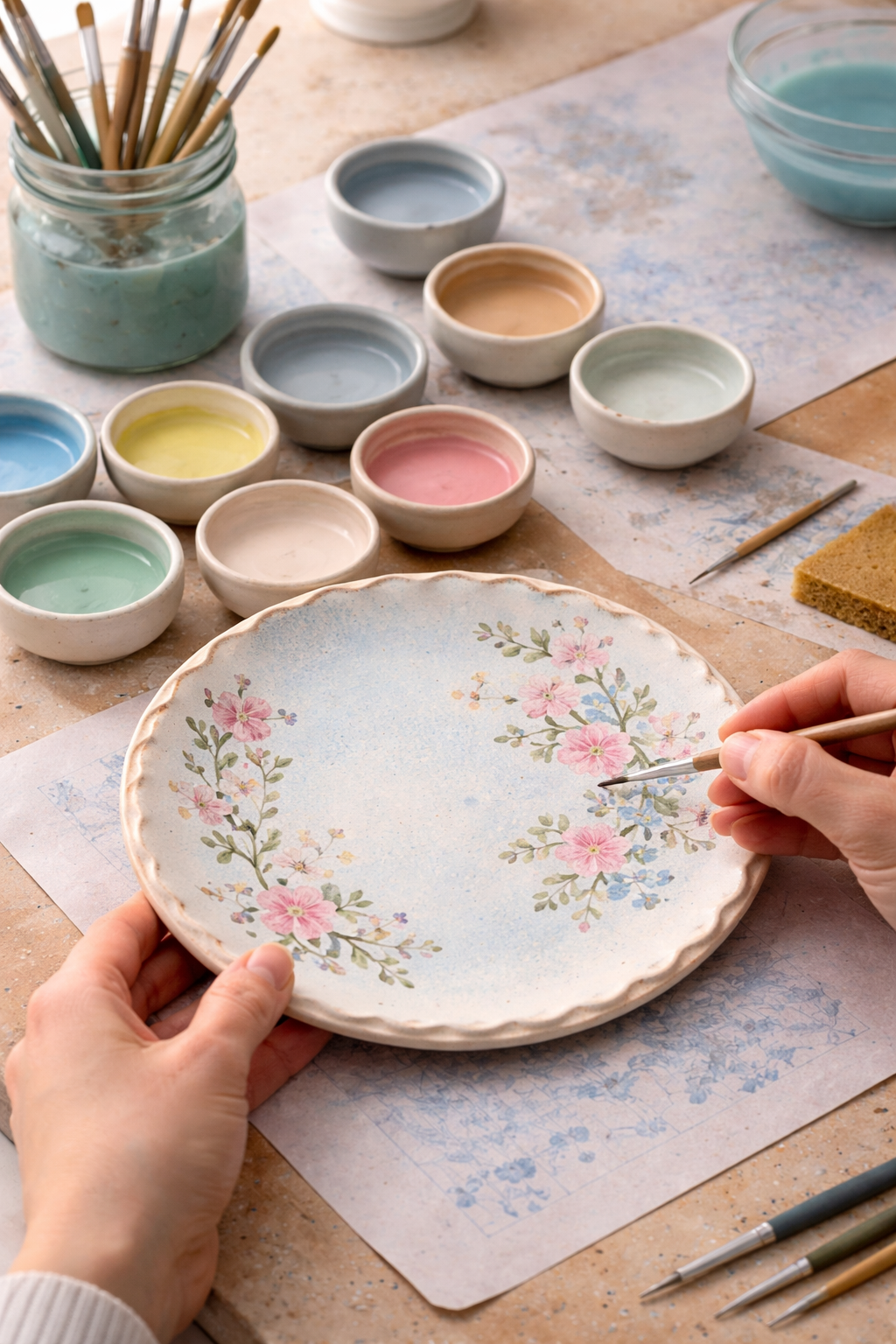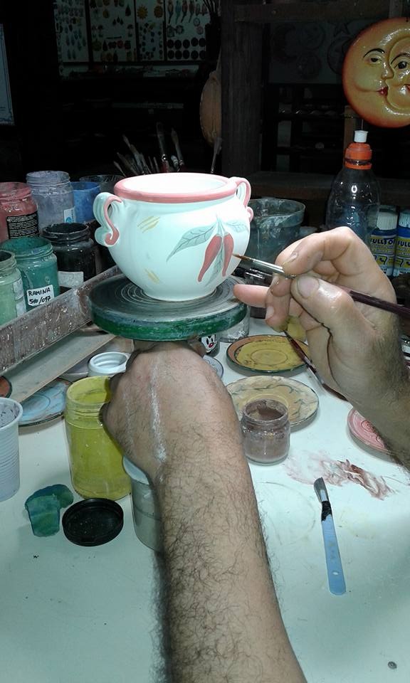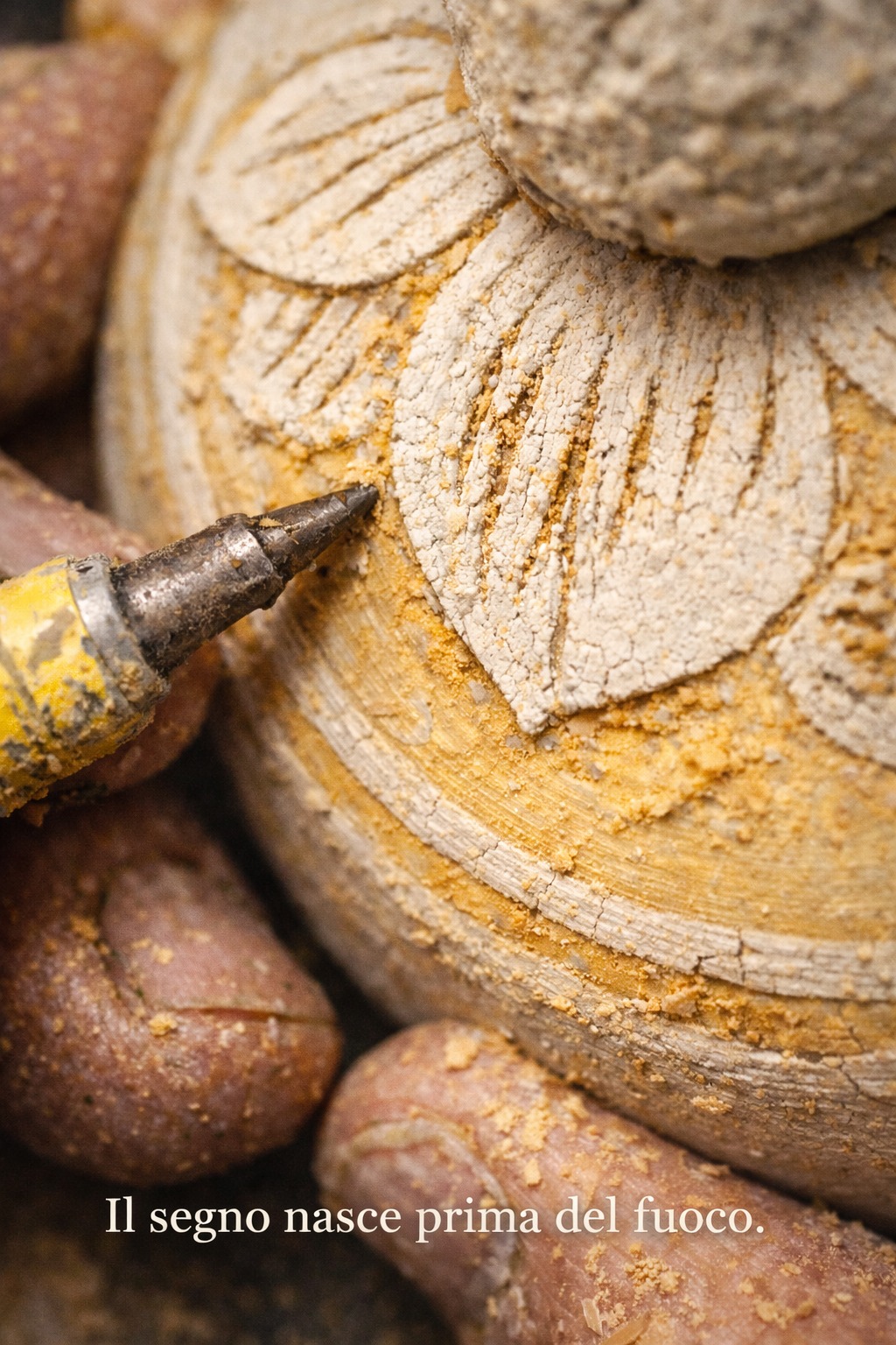 La bottega è uno spazio operativo, in cui la ceramica attraversa tutte le sue fasi. L'argilla viene preparata, lavorata, modellata, lasciata asciugare e cotta. Ogni oggetto nasce da una sequenza di passaggi necessari, che richiedono tempo e attenzione. Il tornio definisce la forma attraverso il movimento. La lavorazione manuale interviene sulla materia in modo diretto. La cottura fissa ciò che è stato fatto. All'interno della bottega convivono oggetti in fasi diverse: crudi, essiccati, cotti, smaltati. Non esiste un momento unico del lavoro. Esiste un processo continuo.